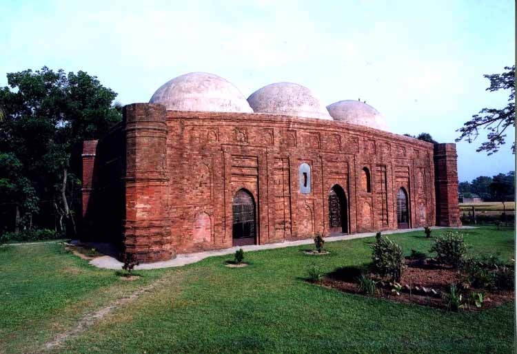 Elegant domes and terracotta details of Kherua Mosque, Bogra’s Islamic architectural treasure.